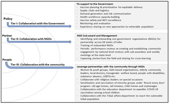 The collaboration model was designed and implemented with a three-tiered approach, viz., collaboration with the government, NGOs, and the community, as depicted in Figure 2.