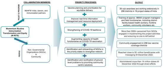 World Health Organization (WHO), in its operational planning guidelines to support country-preparedness and response to COVID-19, has prioritized risk communication and community engagement by recommending collaborating with civil society as an important approach to dealing with the impact of the pandemic [16]. Similarly, USAID has also prioritized COVID-19 vaccination in the most vulnerable population groups; reaching them could be more successful through collaboration [17]. Collaborations are categorized in public health literature as level-based (person, population, or research), solution-based, or third-party-based [18]. ‘Solution-based collaborations’ are geared toward specific problems such as diseases or outbreak conditions and have been utilized well in managing situations in the past [19,20]. The project’s multilevel collaboration is ‘solution-based’ as it engages ground-level NGOs in a sustainable network and strives to strengthen the skills of collaboration partners, as well as optimizing the use of limited resources to attain the common objective of equitable vaccination.