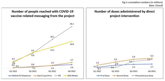 The project, with its prompt and proactive on-ground implementation, reached approximately 50 million beneficiaries (January–December 2022) through IPC, mid-media (locally-generated communications), hard-copy prints (flyers, leaflets, etc.), and telephonic reminders (on the due date of vaccination and publicizing upcoming camps). The administration of more than 14 million vaccine doses was facilitated between January and December 2022 through ground-based activities by local NGOs and project teams, including mobilizing, facilitating hard-to-reach populations to ongoing camps, and organizing special vaccination camps. Since, the modalities (e.g., folklore, street plays, IPC, communication by faith leaders, community champions, etc.) were culturally acceptable to the target communities, they had a significant contribution in bringing the marginalized communities to the public health mainstream. A significant proportion of doses were facilitated for vulnerable populations (6.1 million). The results are listed activity-wise below.