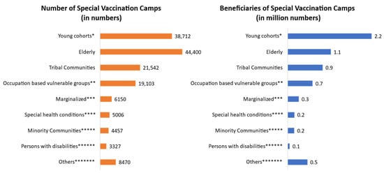 Number of special camps organized for marginalized and vulnerable beneficiaries (until 31 December 2022). * Young cohorts (12–18 years age group) included students, school dropouts, adolescent girls, youth in orphanages, youth in juvenile homes, etc. ** Occupation-based vulnerable groups included workers in factories, brick kilns, salt pans, construction sites, industrial sites, drainage sites, and sugarcane fields, as well as mining workers, daily wagers, truckers, etc.). *** Marginalized included refugees, gypsies, migrants, etc. **** Special health conditions included pregnant and/lactating mothers and people with co-morbidities and other infections. ***** Minority communities included religious minorities such as Sikhs, Muslims, Christians, Buddhists, Jains, etc. ****** Persons with disabilities included mentally and physically challenged people. ******* Others contained in vulnerable groups that were reached in small numbers included jail inmates, drug users, transgender people, etc.