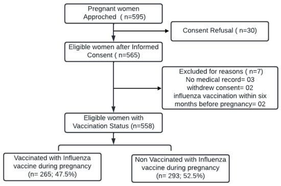 We approached 595 eligible women admitted to the obstetrics ward. Thirty women refused to provide informed consent. Written informed consent was obtained from 565 women, and they were further screened. Of the 565 women screened, two withdrew consent during screening, and three participants had no mother and child protection card or medical notes; hence, they were excluded from our final analyses. Two women who had received influenza vaccination within six months prior to their pregnancy were excluded. The final cohort comprised 558 women (Figure 1).