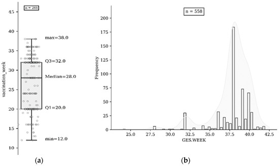 (a) Vaccination based on gestational age in weeks of participants (n = 265); (b) gestational weeks of participants (n = 558).