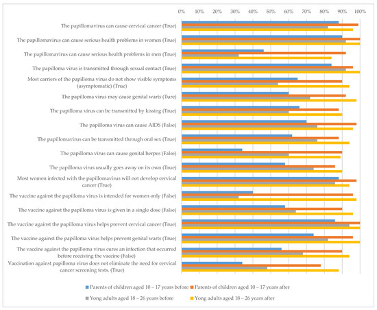 The results of the knowledge questionnaire indicated a significant gap in understanding about the papillomavirus and its vaccine among both parents and young adults. Particularly low percentages of correct answers were observed for certain statements in the baseline questionnaire, summarized as follows. Only 46% of the parents and 32% of the young adults correctly identified that the papillomavirus could cause serious health problems in men. Additionally, 65% of parents and 54% of young adults did not know that most carriers of the virus do not exhibit visible symptoms. Only 34% of parents and 60% of young adults correctly identified that the papillomavirus cannot cause genital herpes. Only 40% of parents and 32% of young adults knew that the vaccine is not intended for women only, and 58% of parents and 64% of young adults were not aware that the vaccine requires multiple doses. In addition, 56% of parents and 68% of young adults did not know that the vaccine cannot cure an infection that occurred before receiving the vaccine. Finally, only 34% of parents and 48% of young adults knew that vaccination against papillomavirus does not eliminate the need for cervical cancer screening tests. The follow-up questionnaires indicated a significant improvement in the percentage of correct answers after the use of the decision aid, with both groups, parents and young adults, showing 78–100% accuracy in answering each of the 18 statements (see Figure 1).