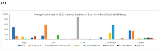 Table 1 also presents summary statistics for statistical areas clustered by distinct ideological worldviews and political beliefs. We proxy for statistical area political belief using the distribution of votes among political parties in Israel’s March 2020 national parliament elections. We compute votes by the party in each of the statistical areas and then use the k-means clustering method (see [,]) to classify each of the 1350 statistical areas into one of five political belief groups. Essentially, the k-means procedure partitions N observations into k sets, minimizing the within-set variance. The k number of sets is determined based on the elbow method (see, e.g., Ref. []).