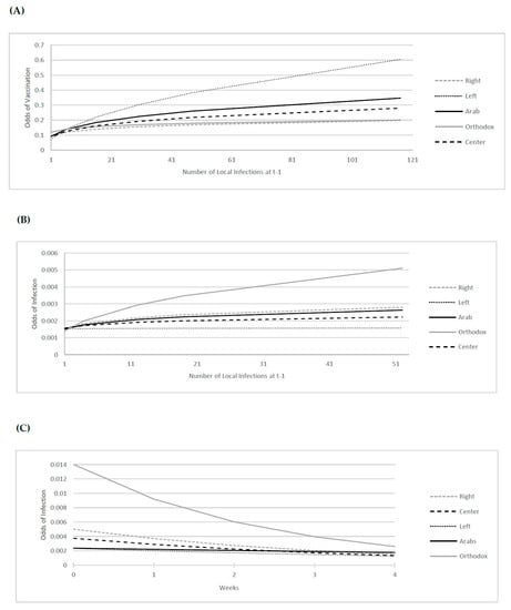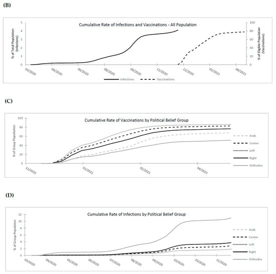 The purpose of this study is to examine the role of political belief in COVID-19 vaccine uptake, virus transmission, and closure policy response. We employ unique panel data on all COVID-19 vaccination and infection cases in Israel over the March 2020–April 2021 study period. Model estimates are used to simulate the aggregate effects of more risk-averse political beliefs on vaccine resistance and disease transmission. Israel provides an ideal laboratory to analyze the role of political belief in COVID-19 virus risk, vaccination resistance, and related policy treatment. The country is comprised of diverse populations holding significantly divergent worldviews and political beliefs, including left- and right-wing ideologues, Arab ethnic and religious minorities, and orthodox religious Jewish groups. Moreover, COVID-19 policy interventions in Israel were not framed in partisan terms and were broadly supported by leaders across the political spectrum. Hence, unlike the U.S. and elsewhere, household response to COVID-19 risk in Israel was not biased by contemporaneous disagreement and partisan debate among political leaders. (for analyses of partisan disagreement and COVID-19 health behaviors in the U.S., see [,,]). Additionally, the provision of universal health care and related availability of comprehensive electronic medical records in Israel allowed full, accurate, and timely tracking of virus incidence and vaccine uptake. Israel was an early adaptor of comprehensive testing and vaccination but experienced three severe spikes in virus incidence over the course of our study period. As of February 2021, Israel led the world with a population first-dose vaccination rate of 28 percent, more than three times the next highest country. By the end of our sample (April 2021), Israel had a first-dose vaccination rate of 58 percent and was ranked first in the world [see https://ourworldindata.org/covid-vaccinations (accessed on 17 March 2022)].