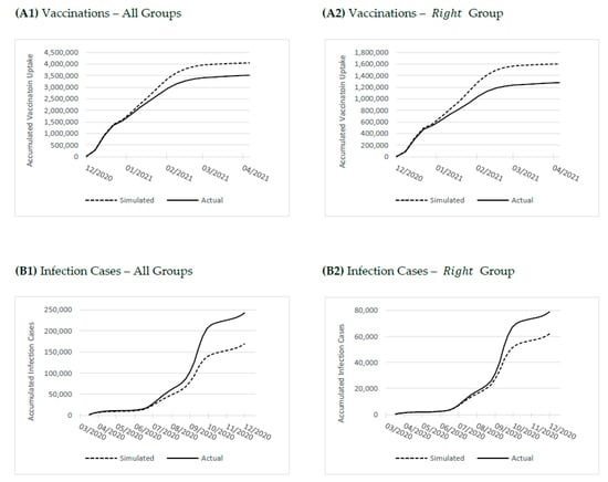 Simulated (versus actual) infection incidence and vaccination uptake had political belief groups responded to virus risk with behaviors of the group.