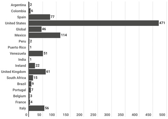 Moreover, the results of this study are consistent with previous research that has shown that the COVID-19 pandemic, like any pandemic [1], has become a global phenomenon that has captured the attention of digital media around the world [2,4]. The algorithm created for this research scrapped 109 Catholic media outlets in five different languages: Spanish, English, French, Portuguese and Italian. In total, it collected 968 publications from 58 websites. More than half of the publications retrieved by the algorithm and, therefore, analysed in this research, came from websites in English (62%) and a little less than a third (28%) from websites in Spanish. Fewer publications were from Italian (6%), French (3%) and Portuguese (2%) websites. The sites from which the largest number of publications were retrieved are Crux (135) and ACN web (102). In addition, noteworthy numbers of the publications were analysed from Catholic News Agency (61), American Magazine (53), Catholic Philly (51), National Catholic Register (51) and Diario Católico (51). Less than 50 publications were recovered and analysed from the rest of the websites covered in this research. Moreover, almost half of the publications analysed (49%) come from U.S. websites (Figure 2). These results suggest a higher attention given by the mentioned Catholic media outlets and languages to the vaccine topic. However, this may also be because the algorithm was more successful in retrieving vaccine-related content from some media than from others and, as a result, collected a greater number of publications from those media. Therefore, the results should be interpreted with caution.