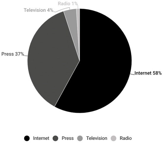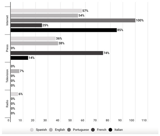 Most of the publications correspond to media whose original support is the Internet (58%) (Figure 3). This can be observed in the publications of all languages, except for French-language publications, where 74% of the publications correspond to media whose original support is the press. In the remaining languages, Internet media publications correspond to 54% of English publications, 57% of Spanish publications, 85% of Italian publications and 100% of Portuguese publications. The only language in which media whose original support is television was identified is English (7%) (Figure 4).