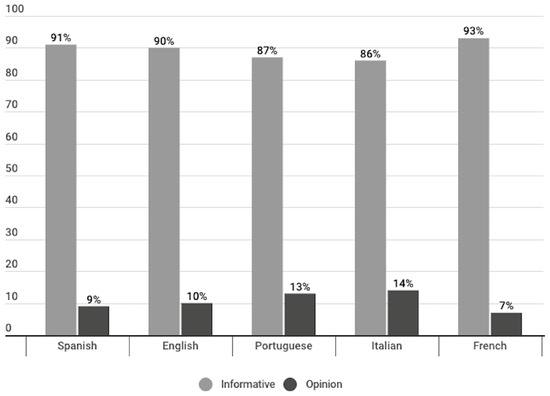 Regarding the journalistic genre, the most frequently used was the informative genre, accounting for 90% of the publications, compared with 10% opinion publications. The language in which the opinion genre obtained the highest percentage was Italian, with 14% of publications, followed by Portuguese publications, that reached 13% of this type of publications. Likewise, in all languages, informative publications accounted for more than 85% (Figure 6); French was the language with the highest percentage of informational publications (93%), followed by Spanish informative publications with 91%, and English with 90% informative publications.