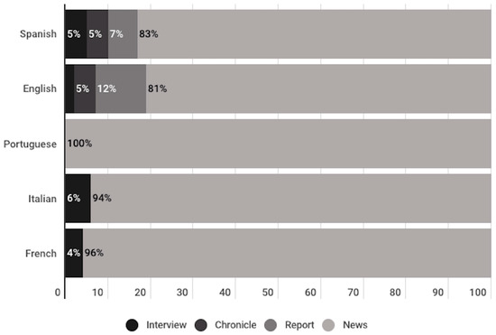 It can be observed that news reports and chronicles were only identified among publications in Spanish and English. In addition, only news items were found in Portuguese-language publications. This subgenre was the majority in all the studied languages, representing more than 80% of the publications in all the languages (Figure 7).