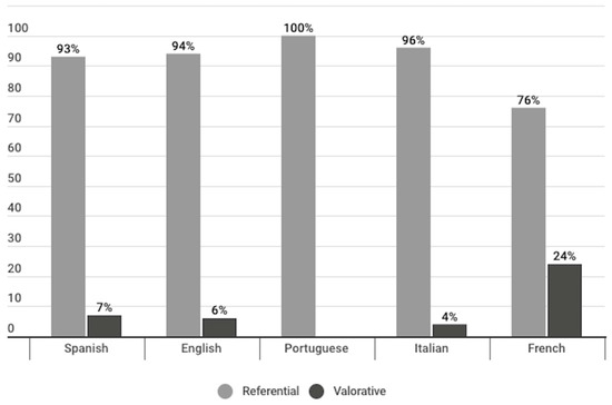 Most of the headlines among informative publications were referential (93%), meaning that they intended to be objective, and they are true or not false. A minor percentage of informative headlines (7%) were of an evaluative type (valuative), which embody an interpretative order insofar as they reflect an interpretation of the journalist or author of the publication in accordance with his or her values, interests, or ideology. French-language publications used the greatest number of valuative headlines (24%) (Figure 8).