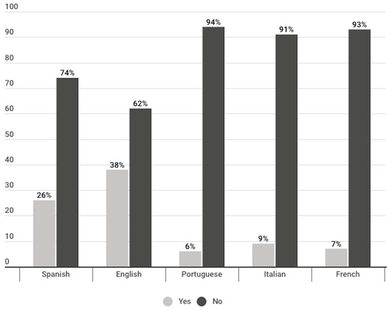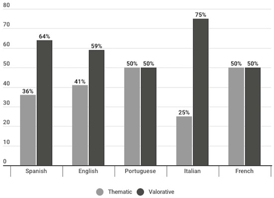 When compared by language, publications in French used the greatest number of valuative headlines (24%). In publications in Spanish (7%), English (6%), and Italian (4%), a lower use of this type of headline was detected, while no publications in Portuguese were identified with this type of headline (Figure 8).