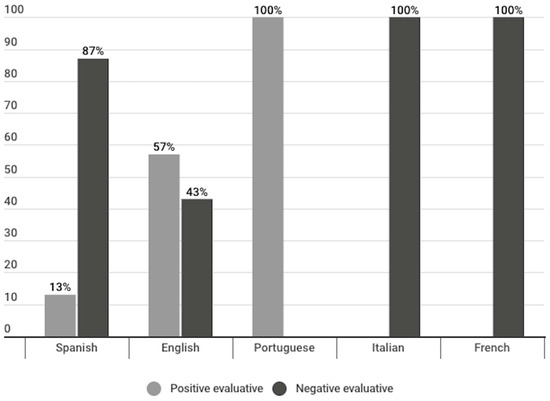 Another result that is worth highlighting is the fact that within the informative publications, French publications presented 24% evaluative headlines. The language that used the most headlines of this type after French was Spanish with 7%, which shows a difference between French and the rest of the languages. Sixty-one percent of the evaluative headlines had a negative connotation. However, this majority is not observed in all languages. The language division shows how this majority is observed in French and Italian evaluative headlines, in 100% of the cases, and in the Spanish evaluative headlines, in 87% of the cases. However, in evaluative headlines in English, 57% of the headlines contained a positive connotation, and in the case of the evaluative headlines of the opinion publications in Portuguese, 100% were positive (Figure 11).