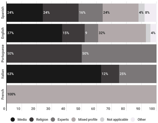 This trend is observed in both Spanish and English publications. However, this does not occur in Portuguese, French and Italian publications (Figure 12). In Portuguese, the authors identified are mainly linked to the fields of experts in different disciplines (50%) and religion (50%). In French, all the authors have a mixed profile. Finally, in Italian, the largest number of authors are linked to the media (63%), followed by the fields of experts in health sciences (25%) and religion (12%). Once more, it is important to note that the results for Portuguese and French publications cannot be considered representative given that only two opinion publications were identified in each language.