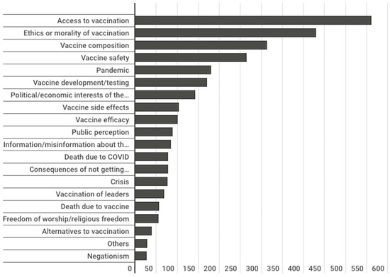The second most recurrent theme was information and misinformation on COVID-19 vaccines, i.e., publications that aimed to provide useful data on vaccines. The third most frequent topic was related to vaccine composition. The rest of the categorised topics occupied a considerably smaller space.