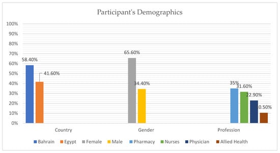 A total of 389 healthcare workers consented to participate from Egypt (41.6%) and Bahrain (58.4%). There were more females (65.6%) than males (34.4%) and majority of the population was from pharmacy background (35%), followed by nurses (31.6%), physicians (22.9%), and allied health personnels (10.5%), as shown in Figure 1.