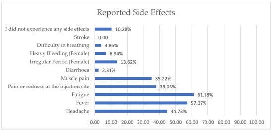The top three types of COVID-19 vaccines taken by healthcare workers were Pfizer–BioNTech, Sinopharm, and AstraZeneca–Oxford (Figure 2). The reported side effects are illustrated in Figure 3, and fatigue and fever were reported in over 50% of the cases.