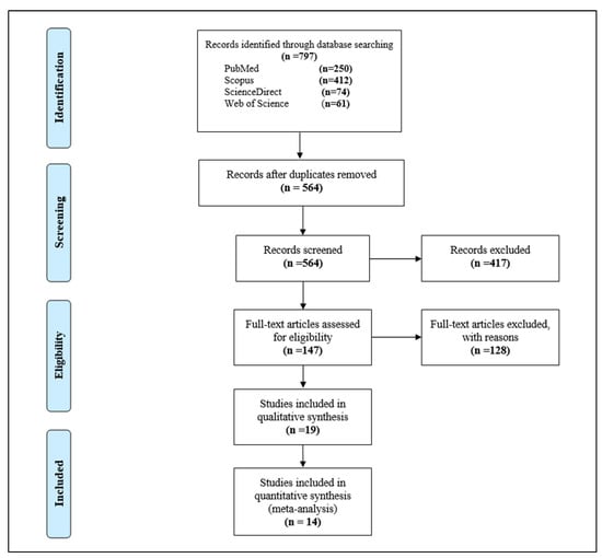 According to the search strategy described in Table S2, 797 potential studies were retrieved. Of these, 233 articles were duplicates. Another 417 irrelevant studies were excluded during the title and abstract screening. Following full text screening, 128 irrelevant articles were excluded, leaving 19 articles eligible for data extraction and inclusion in the qualitative analysis. Of them, only 14 studies were included in the meta-analysis. A flowchart of the systematic literature search, as well as the selection process, is summarized in the PRISMA format (Figure 1).