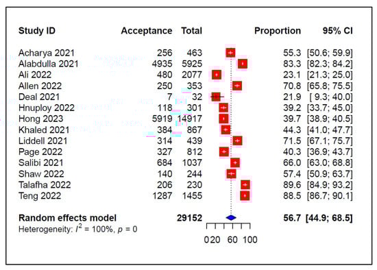Vaccination remains one of the most cost-effective measures for preventing disease spread and limiting disease burden. Hence, it has played a critical role in containing the COVID-19 pandemic, significantly reducing infection rates, deaths, and the number of serious illnesses associated with COVID-19 infection []. However, the vast majority of the adult population should be vaccinated for COVID-19 vaccination strategies to be effective in any country. This goal is unlikely to be met unless all members of the community, including migrants, refugees, and foreign workers, are fully vaccinated. Given the availability of several COVID-19 vaccines, government and public awareness campaigns have convinced many people to get vaccinated. However, vaccine hesitancy remains a major challenge, as many people are still unwilling to receive the vaccination, are less likely to accept the booster shots, and are even hesitant to vaccinate their children. According to this SRMA, the overall prevalence of COVID-19 vaccination acceptance among the 29,152 migrants involved in 14 studies across 14 countries was 56.7% (95% CI: 44.9–68.5%). This rate was lower than previous estimates of COVID-19 vaccine acceptance observed in the global population (67.8%) [], healthcare workers (65.65%) [], and healthcare students (68.8%) []. The lower acceptance rate among migrants compared to healthcare workers and students is possibly because they may not have been exposed to various health-related information, which may result in low levels of awareness about the COVID-19 vaccines’ safety and effectiveness, thereby influencing their decision to be vaccinated. Meanwhile, healthcare professionals may be well informed about the benefits of vaccination against infectious diseases. In the same manner, the pooled estimate of the acceptance rate in this SRMA was lower than the global average for the general population (67.8%) []. It was also lower than the 61% acceptance rate reported in a previous SRMA of 172 studies conducted in 50 countries []. Furthermore, Wang et al. estimated that 81.65% of the general population would be willing to receive vaccinations based on the findings of 38 studies []. The variations in COVID-19 vaccine acceptance rates could be attributed to study period and study population differences.