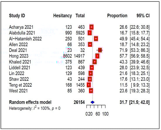 Pooled prevalence of COVID-19 vaccine hesitancy [,,,,,,,,,,,].
