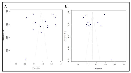 Funnel plot of publication bias of the included studies. (A) Vaccine acceptance. (B) Vaccine hesitancy.