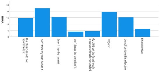 Reasons for not wanting to vaccinate children with asthma are presented in Figure 1. The highest reported reason for non-vaccination was “I don’t think my child needs it” (22.3%) followed by “I forget it” (19.5%), while the least reported reason was “I don’t know the benefit of it” (4%).