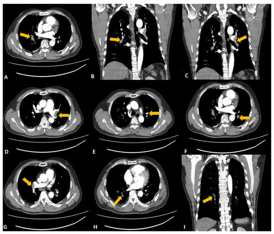Chest aortic dissection angio-MDCT (Multi Detector Computed Tomography), (A) Right main pulmonary artery, (B) right middle lobe thromboembolism, (C,D) left main pulmonary artery, (E) left upper lobe pulmonary artery, (F) left lower lobe pulmonary artery, (G) right main pulmonary artery, (H,I) right lower lobe thromboembolism. Arrows point to suspected thrombosis sites.