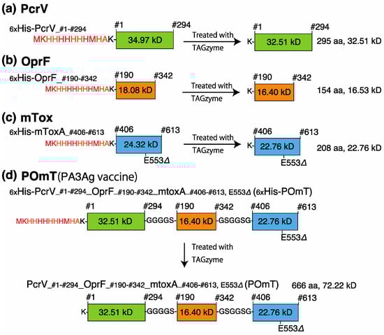 The coding sequences of full-length PcrV, the outer membrane domain (#190-342) of OprF (OprF#190-#342), and the carboxyl domain (#406-613) of exotoxin A (ToxA#406-#613) were polymerase chain reaction (PCR)-amplified from the P. aeruginosa PA103 chromosome. Specific PCR primer sets are listed in Supplementary Table S1. The enzymatic active glutamic acid at #553 of toxA#406-#613 was deleted by a specific PCR oligonucleotide (toxA_D553) to generate a non-catalytic mutated exotoxin A fragment (mToxA#406-#613(E553Δ)) [,,]. The DNA sequences of PcrV, OprF#190-#342, and mToxA#406-#613(E553Δ) were connected to glycine–serine short linker oligonucleotide sequences (5′-GGA TCC GCC ACC GCC-3′ for GGGGS between PcrV and OprF#190-#342, and 5′-ACC GGA ACC CCC TGA ACC-3′ for GSGGSG between OprF#190-#342 and mToxA#406-#613(E553Δ)) to create a synthetic trivalent protein antigen named POmT (which stands for a conjugate of PcrV and parts of OprF and mutated exotoxin A) composed of full-length PcrV-GGGGS-OprF#190-#342-GSGGSG-mToxA#406-#613(E553Δ). The PCR amplicons were ligated to the cloning site of an expression vector (32932, TAGZyme pQE-2, Qiagen, Hilden, Germany) to create recombinant hexahistidine-tagged proteins in Escherichia coli. After the purification, dialysis, and endotoxin removal processes, the amino-terminal hexahistidine tags of the recombinant proteins were removed using exopeptidases (34362, TAGZyme DAPase Enzyme, Qiagen, Hilden, Germany). The above details were described in our past report []. Tagless POmT, composed of 666 amino acids with two glycine–serine linkers, was a 72.22-kDa protein. The blueprint of each protein antigen is presented in Figure 1.