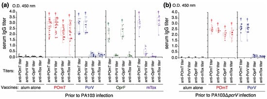 In the first series of experiments in which vaccinated mice were eventually infected with P. aeruginosa PA103 (Figure 3a), serum anti-POmT IgG titers in mice vaccinated against POmT, PcrV, OprF, or mTox were statistically significantly increased compared with the control titers († p < 0.01). Anti-PcrV IgG titers from mice vaccinated against POmT or PcrV, anti-OprF IgG titers from mice vaccinated against POmT or OprF, and anti-mTox IgG titers from mice vaccinated against POmT or mTox were significantly increased († p < 0.01). In the second series of experiments, in which vaccinated mice were later infected with the isogenic mutant PA103ΔpcrV strain (Figure 3b), vaccinated mice exhibited a similar antibody titer profile as those in the first series of experiments.