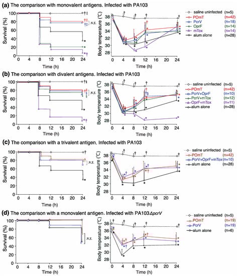 Third, the three-antigen mixed vaccine (PcrV+OprF+mTox) group was compared with the POmT group (Figure 4c). There was no significant difference in the survival rate 24 h after PA103 administration between these groups (79% vs. 70%). At 8 h after bacterial administration, the body temperature in the surviving mice was 32.2 ± 2.3 °C in the POmT group and 32.9 ± 1.8 °C in the PcrV+OprF+mTox group. At 12 h after infection, the body temperature was 34.3 ± 2.2 °C in the POmT group and 34.3 ± 1.5 °C in the PcrV+OprF+mTox group. At 12 h, the body temperature was significantly higher in the POmT and PcrV+OprF+mTox groups than in the alum-alone group († p < 0.001 and † p = 0.016, respectively). However, body temperature did not differ between the POmT and PcrV+OprF+mTox groups over 24 h.