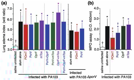 Lung edema index and myeloperoxidase (MPO) activities in lung homogenates from vaccinated mice infected with P. aeruginosa. (a) Lung edema index at 24 h after intratracheal infection with either P. aeruginosa PA103 or PA103ΔpcrV. (b) MPO activities in the lung 24 h after infection with PA103. Data are shown as the mean ±SD. * p < 0.05 against the saline-treated uninfected control; † p < 0.05 against the alum-alone-vaccinated group. PcrV, full-length PcrV; OprF, the outer membrane domain (#190-342) of OprF; mTOX, a non-catalytic mutated domain (#406-613, E553Δ) of exotoxin A; POmT, a conjugate of PcrV, and parts of OprF and mutated exotoxin A; MPO, myeloperoxidase; w/d, wet-to-dry weight ratio.