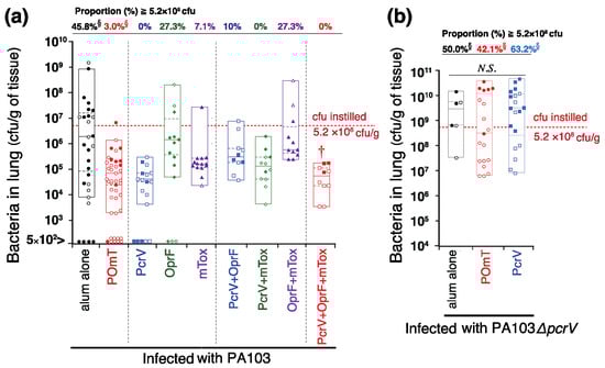 Total bacterial counts in the lungs were calculated in both surviving and dead mice 24 h after P. aeruginosa infection (Figure 6). Following PA103 infection, lung bacterial counts were significantly lower in the PcrV+OprF+mTox group than in the alum-alone group (Figure 6a) († p = 0.006). No significant differences were observed between the other groups and the alum-alone group. Following PA103ΔpcrV infection, the number of bacteria was lower in the POmT group than in the PcrV and alum groups, albeit without statistical significance (Figure 6b). More mice in the group immunized with POmT were found to have a decreased number of bacteria in their lungs relative to the initial bacterial dose (cfu/gram of lung tissue) (§ p < 0.05) (red dashed lines, Figure 6a).