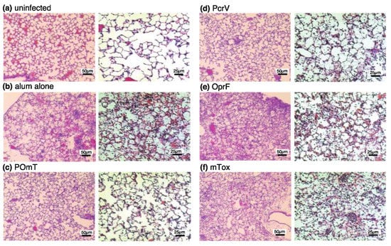 Lung histology of the surviving mice (two mice/group) at 24 h post-infection with P. aeruginosa PA103. After the fixation with 10% formaldehyde, hematoxylin–eosin staining and paraffin embedding were performed. (a) Saline-treated uninfected group, (b) alum-alone group, (c) POmT group, (d) PcrV group, (e) OprF group, and (f) mTox group. Magnification 200×, scale bar = 50 µm. Magnification 400×, scale bar = 25 µm. PcrV, full-length PcrV; OprF, the outer membrane domain (#190-342) of OprF; mTOX, a non-catalytic mutated domain (#406-613, E553Δ) of exotoxin A; POmT, a conjugate of PcrV, and parts of OprF and mutated exotoxin A.