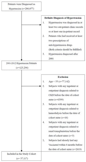 This study screened all patients who were diagnosed as having hypertension based on the International Classification of Diseases, Ninth Revision, Clinical Modification (ICD-9-CM) code 401.X-405.X and who visited health-care facilities in Taiwan over 12 years from 1 January 2000, to 31 December 2012. In the first part, hypertension was diagnosed in at least two out-patient clinic records or at least one in-patient record, and patients who had received at least two prescriptions of anti-hypertension drugs. We excluded 86,179 patients due to following reasons: Patients were aged <55 years (n = 77,142), and patients with any inpatient or outpatient diagnosis related to CKD before the date of cohort enter (n = 6399), and patients with any inpatient or outpatient diagnosis related to hemodialysis before the date of cohort enter (n = 16), and patients with any inpatient or outpatient diagnosis related to renal transplantation before the date of cohort enter (n = 3), and patients had already had any Vaccinated within 6 months before the date of cohort enter (n = 2619). Finally Included in the Study Cohort (n = 37,117; Figure 1). In addition, a 1-year washout period (2000) was included to ensure that all patients in this cohort had no CKD or dialysis before enrollment. The influenza vaccines were all given by intramuscular injection. The vaccination status was recognized based on the presence of code V048 or the use of the vaccine [confirmed by drug codes of Vaxigrip® (inactivated trivalent influenza vaccine, Sanofi Pasteur, France); AdimFlu S® (inactivated trivalent influenza vaccine, Adimmune Corporation, Taiwan), Fluvirin® (inactivated trivalent influenza vaccine, Novartis, UK)]. The primary endpoints of our study were the incidence of CKD (ICD-9-CM code 585.X) and the requirement of dialysis (NHI procedure codes) in patients with hypertension. All cohorts were followed up until the date of the diagnosis of CKD, dialysis, death, disenrollment from the NHI, or the end of 2012.