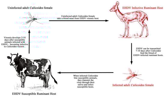 Culicoides midges are the only known arthropod vector for EHDV, with a key role in the life cycle and viral dissemination from infected to susceptible vertebrate hosts [4] (Figure 1). Culicoides are found all over the world except New Zealand and Antarctica. More than 1400 species of Culicoides are known, of which more than 30 can transmit EHDV [16]. The global distribution of EHDV depends on the arthropod vector’s geographical occurrence and distribution and susceptible vertebrate hosts. Overall, vector competence can vary for different EHDV strains within a Culicoides species, impacting the geographic distribution of EHDV serotypes [4]. Factors affecting the competence of Culicoides for viral dissemination include the virus serovar and arthropod vector genotype as well as environmental factors such as temperature and humidity [17,18].