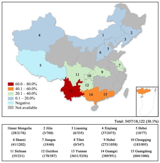 Seroprevalence of EHDV in tested domestic ruminants from 15 provinces in China between 2014 and 2019. Data from Duan et al. [21].