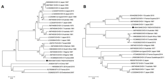 Phylogenetic analyses of EHDV based on Seg-3 (A) and Seg-2 (B) of YNDH/V079/2018 from Mangshi County, Yunnan Province, China (according to Yang et al. [29]).
