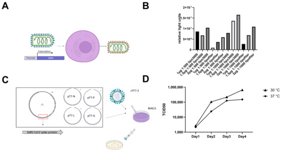 To generate a replication-competent VSV-SARS-CoV-2 (rVSV-SARS-CoV-2) pseudovirus, we synthetized a plasmid harboring the VSV antigenome with a luciferase reporter inserted between VSV-M and VSV-G. Then, the G gene was replaced by S-D614G with a 21-aa deletion at the C-terminus. This 21-aa sequence has been reported to be essential for the efficient replication of rVSV-SARS-CoV-2. Plasmid-based rescue of rVSV-SARS-CoV-2 was carried out as described previously [8] (Figure 1C) and generated a slowly replicating virus bearing the spike protein in the envelope. This virus was then amplified by passage in Vero E6 cells. Virus replication dynamics were characterized after low MOI (0.1) infection at 30 °C and 37 °C, respectively. We observed high viral titers 72–96 h following infection, and the viral titers were significantly higher at 30 °C (Figure 1D).