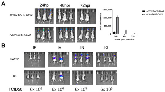 The study was approved by the Animal Care and Use Committee at the National Institute for Food and Drug Control (NIFDC). Three-week-old C57BL/6 and hACE2 KI mice were obtained from the Institute for Laboratory Animal Resources, NIFDC. The mice were infected with scVSV-SARS-CoV-2 or rVSV-SARS-CoV-2 harboring spike protein with the indicated mutation via intraperitoneal (IP), intravenous (IV), intragastric (IG), or intranasal (IN) injection. Two to four mice were used in each group. Three independent experiments were conducted and representative images are shown. The bioluminescent signals were monitored at the indicated timepoints post-infection.