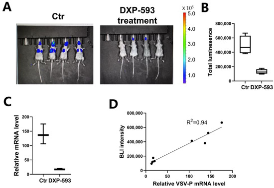 With the continuation of the COVID-19 pandemic around the world, mouse models to assess potential antiviral agents are urgently needed. BGB-DXP593 is a monoclonal neutralizing antibody identified from the B cells of convalescent COVID-19 patients [9] that can neutralize pseudovirus harboring S-D614G in vitro [10]. We used our infection model to assess the in vivo prevention efficacies of this antibody. Mice were administered two doses of the BGB-DXP593 mAb individually (20 mg/kg) via the intravenous (IV) route before pseudovirus exposure (days −2 and −1) and were then challenged with IN administration of rVSV-SARS-CoV-2 (day 0). Nearly complete protection was conferred by BGB-DXP593 mAb (Figure 3A,B). Quantitative PCR was performed using primers targeting the VSV-P gene, which resides in the backbone of the pseudovirus, and the data were normalized to that of the Gapdh gene (Figure 3C). The results confirmed that the viral load significantly decreased in the mAb-treated group. We further performed linear regression and found a good correlation between the relative VSV-P mRNA level and BLI (r2 = 0.94), suggesting that bioluminescence intensity reflects the viral load in vivo (Figure 3D).