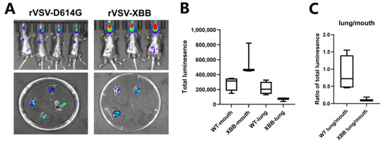 Because of the highly variant nature of SARS-CoV-2, evaluation of the pathogenesis and virulence of different variants is important. Pseudoviruses enable different mutants to be easily constructed. We constructed rVSV-SARS-CoV-2 harboring the S gene from XBB strain. rVSV-SARS-CoV-2 (D614G) and rVSV-SARS-CoV-2 (XBB) reached similar titers on Vero cells and particle numbers were quantified by quantitative PCR. We then tested their infection ability in vivo. Mice infected with rVSV-SARS-CoV-2 (D614G) showed viral loads in the mouth and/or lungs (Figure 4A,B), while mice infected with rVSV-SARS-CoV-2 (XBB) showed significantly lower viral loads in the lungs (Figure 4C).