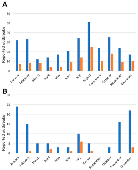 Reported outbreaks by month (cumulative number across all years) broken down by southern (Kherson, Odesa, Mykolaiv; orange bars) and northern (all other; blue bars) oblasts (excluding Crimea); panel (A) showing domestic pig and panel (B) wild boar outbreaks.