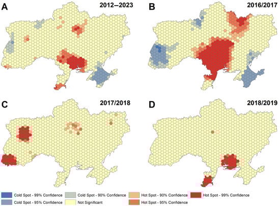 Series of hotspot maps, with colors trending towards red indicating high and trending towards blue low ASF outbreak activity. Panel (A) based on all reported cases from 2012 through May 2023; panels (B–D) by season (April–March) for the years with the highest numbers of ASF outbreaks 2016/2017 (B), 2017/2018 (C) and 2018/2019 (D).