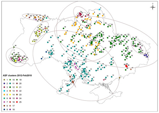 Epidemiological clustering of ASF outbreaks in Ukraine, 2012–2018 (numbered chronologically) according to the “biology and behavioral model”. Ellipses refer to one standard deviation around the mean geographic center of outbreaks.