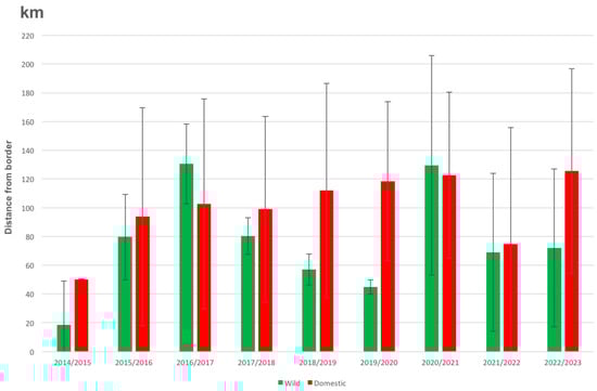 Graph depicting the average distance and standard deviation of outbreaks from official borders or the north of Crimea oblast by season (April–March) for domestic pigs (red) and wild boars (green).