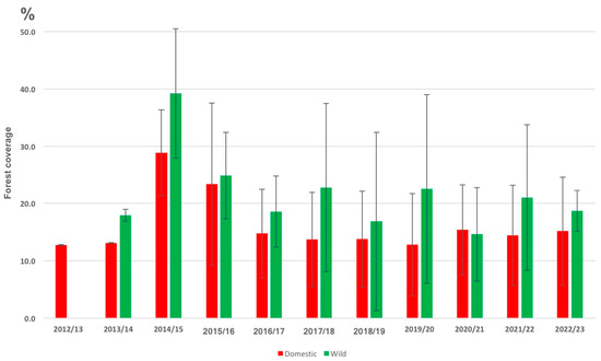 Correlation of ASF outbreaks with forest coverage showed that outbreaks in wild boar (2013–2023) correlated with higher percent forest coverage within 25 km of outbreaks than the average for all of Ukraine, a trend that was marginally significant (F = 4.34, p = 0.059, one-way ANOVA) (Figure 6). This trend was marked in the 2014/15 hunting season (25–39% forest coverage within 25 km of outbreaks), possibly reflecting introduction and spread of ASFV in wild boar migrations from forested international borders towards the interior of Ukraine (Figure 4). Occurrence of ASF outbreaks in domestic pigs in forested regions also peaked in 2014/15, although the incidence is not significant. The average forest coverage around outbreaks in the following years (2016–2023) was below the average across Ukraine (16.8%) for domestic pigs (13–15%) and above for wild boars (17–23%), with the exception of 2020/21, a period in which only two wild boar cases were recorded (Figure 6).