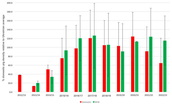 Graph showing the correlation between outbreaks in domestic pigs (red) and wild boars (green) with the modelled population density of domestic pigs in Ukraine in the surrounding area (circles with 25 km radius). Data by season (April–March) and displayed in % of average pig density in Ukraine with standard deviations.