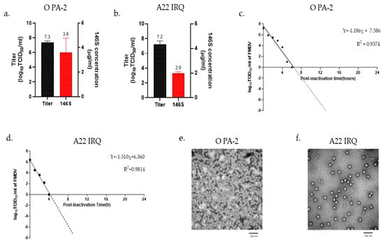 The O PA-2 and A22 IRQ were propagated in a 100 L bioreactor based on the optimal conditions determined from the experiments in the flask. The O PA-2 and A22 IRQ viruses were inoculated into suspension cells at an MOI of 0.001, and the viral infection supernatants were collected at 16 h and 24 h, respectively. The virus titers of the supernatants from O PA-2 and A22 IRQ were 2.21 × 107 TCID50/mL and 1.71 × 107 TCID50/mL, respectively (Figure 1a,b). The amount of 146S antigen in each supernatant was 3.6 µg/mL and 2.0 µg/mL for O PA-2 and A22 IRQ, respectively. The inactivation kinetics after BEI treatment showed a linear slope, and the titers of O PA-2 and A22 IRQ viruses decreased to below 10−7 TCID50/mL within 13 h and 9 h, respectively (Figure 1c,d). After virus inactivation, the physical integrity of the viruses during scale-up in a 100 L bioreactor was examined under an electron microscope, which revealed FMDV particles with a diameter of 25–30 nm (Figure 1e,f).