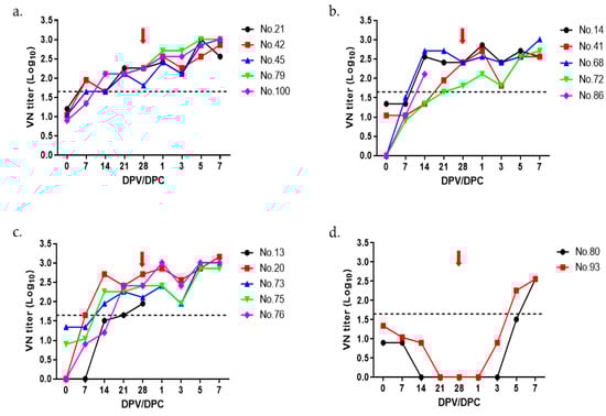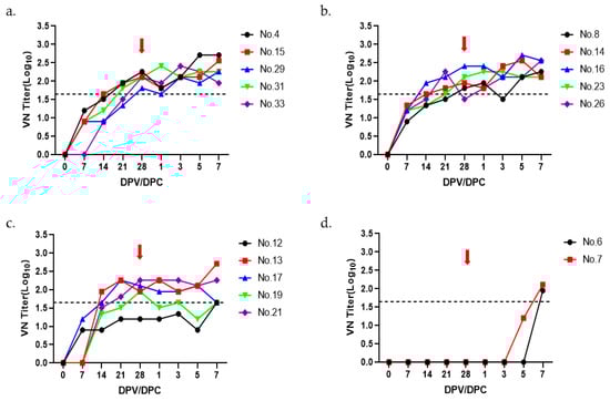 The titers of virus neutralization in pigs following immunization with the O PA-2 vaccine. VN tests were conducted on sera collected from pigs (5 pigs per group except for negative control with 2 pigs) that received trial vaccines containing four different antigen payloads of 20 µg (a), 15 µg (b), 10 µg (c), and negative control (d) up to 28 days post vaccination (dpv). Blood samples were obtained on days 0, 7, 14, 21, and 28 dpv. At 28 dpv, the pigs were exposed to O PA-2 with a viral dose of 1 × 105 TCID50/0.1 mL in the heel bulb. The red arrows indicate the virus challenge introduced at 28 dpv. The dotted line represents the VN titer of 1:45 (1.65 log10), which is considered positive according to the guidelines in the WOAH terrestrial manual [12].