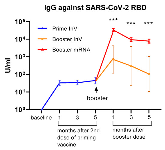 Serum antibody levels (IgG) against the SARS-CoV-2 receptor binding domain (RBD) at 1–5 months following priming (1st and 2nd doses) vaccination and at 1–5 months after the booster dose of COVID-19 vaccination. All of the participants (n = 75) received an inactivated viral vaccine for the priming dose. A total of 69 participants received the mRNA-1273 vaccine as a booster, whereas 6 participants received an inactivated viral vaccine as a booster. The data are presented as GMT and 95% CI. *** p < 0.001, multiple non-parametric test (Mann–Whitney U test), InV = inactivated viral vaccine.